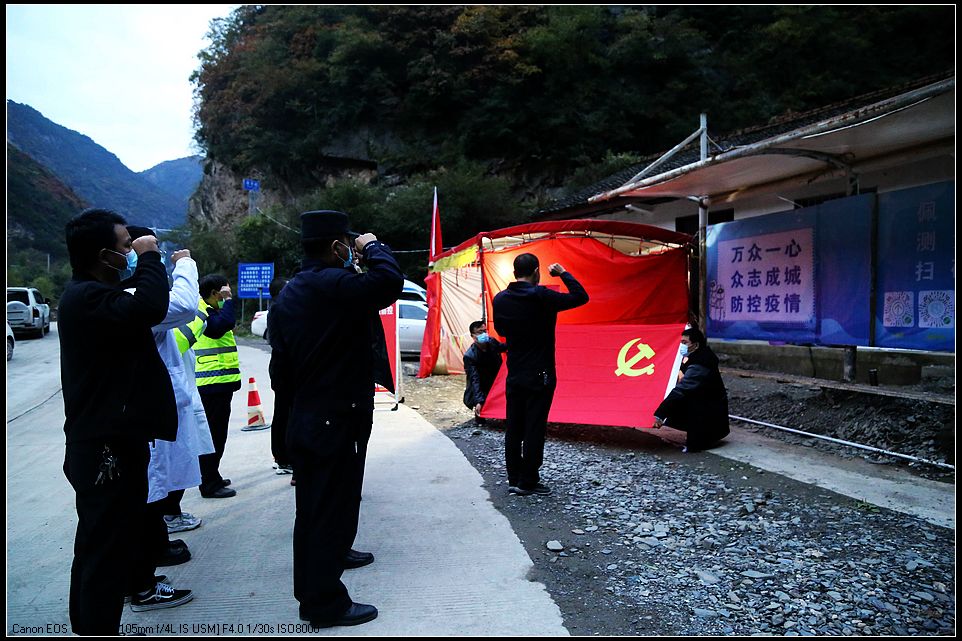 “我志愿加入中国共产党,拥护党的纲领,遵守党的章程……”10月24日晚,一场别开生面的重温入党誓词活动在陕甘交界的凛冽寒风里正在进行。面对日益严峻的复杂防疫形势,虞关乡按照“防控一线在哪里,党支部就建在哪里”的工作要求,最快的速度构筑起一道严密的“红色阵线”,把战斗堡垒驻在疫情防控最前沿,时刻做到关键时间有组织,关键岗位有党员。条件虽然简陋、设施虽然简单,但是下沉干部任劳任怨、毫无怨言,毅然决然加入临时党支部,在“疫”线亮起身份、当起先锋、作起表率,以身作则,身心投入到省界一线疫情防控工作,守护好全县人民的安全。