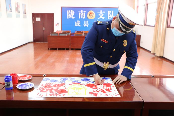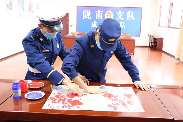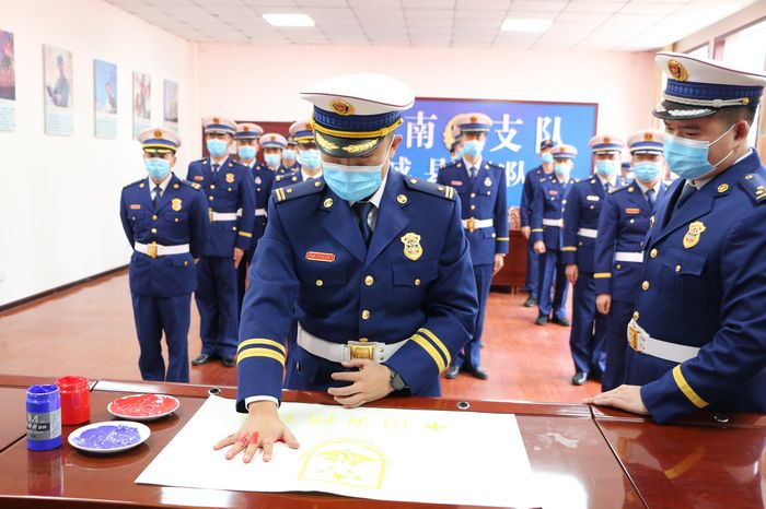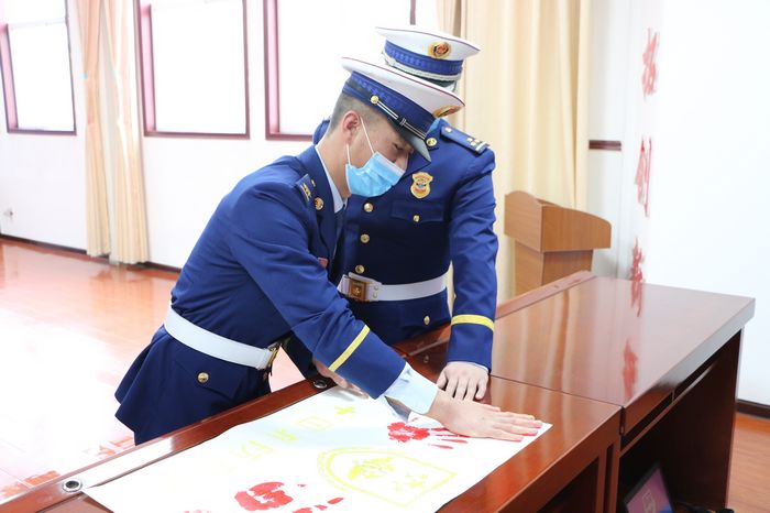 宣誓仪式后,大队全体指战员在队旗上按下手印。手印印证的是全体指战员听号令、铭初心的热血与忠诚;印证的是全体指战员舍小家、顾大家的无私与奉献;印证的是全体指战员敢担当、勇奉献的光荣与自豪。同时,手印是承诺与信念,唤醒的是初心与使命,扛起的是责任与担当,昭示着全体指战员把党中央和习近平总书记亲切关怀转化为换羽新生的强大动力;昭示着全体指战员苦练本领、提升能力,在人民群众最需要的时候冲锋在前的信心决心;昭示着全体指战员对党和人民的无限忠诚和不畏艰险、不怕牺牲的英雄气概。