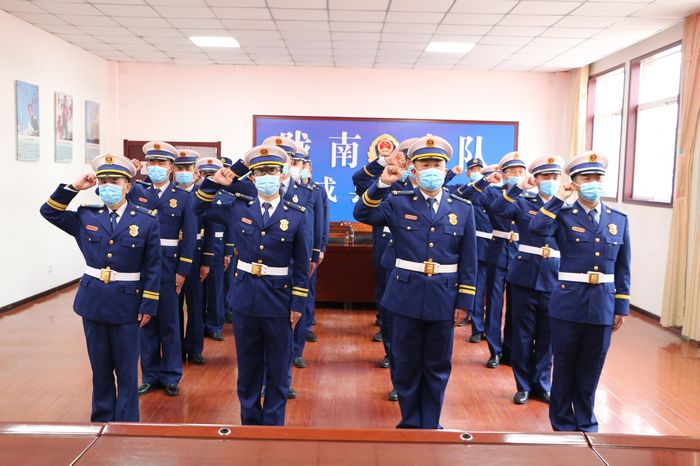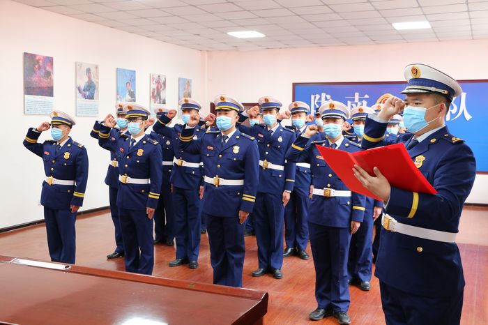 在指导员丁洋的领誓下,全体人员一致举起右手、紧握拳头宣誓:“我志愿加入国家消防救援队伍,对党忠诚,纪律严明,赴汤蹈火,竭诚为民,坚决做到服从命令、听从指挥,恪尽职守、苦练本领,不畏艰险、不怕牺牲,为维护人民生命财产安全,维护社会稳定贡献自己的一切!”每一句誓言都是指战员向队旗作出的庄严承诺,字字扣心,句句千钧,表达了指战员们为消防救援事业奋斗终身的信心和决心。