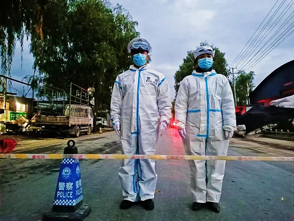 听到陈副队长嘶哑的声音,看到郑豆豆警官脚略跛行的姿势,笔者很感动,且心里过意不去,问他俩该下班休息了,陈队长说:"现在是关键时刻,我们划分地段,每组每片人员,都是二十四小时即要值守封路,又要街道执勤巡逻,警力很紧张,没时间休息啊……好的,我们大家还是要坚持,只要疫情过了就比什么都好啊!"我当即眼眶湿润了,仓促着用手机拍下他俩工作的场面……