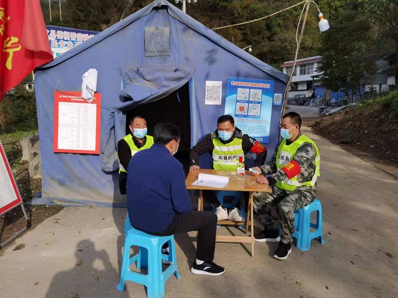 11月5日,笔者实地采访了文县民兵保交护路连,据连长何文介绍,自接到上级疫情防控领导小组的通知以来,我和副连长刘鹏祥同志主动指挥所编民兵投入此次疫情防控工作中,划分防控“梯次”,扎牢紧要“关口”,用疫情防控实战来检验民兵“战斗力”!何连长首先给我们介绍了位于碧口镇一处的疫情防控工作站,“这里人流量大,进进出出的人多,很多还都是其他乡镇的群众,所以我们在这里选派3名民兵,其中2人为退伍军人,他们主要担负过往人员的体温测量、行程码核验等工作”,像这样排兵布阵的点位还有6处,全都是关键路口,守住这些点位,我们的防控就是可靠的。副连长刘鹏祥位于余家湾高速路口,这里车流量大,平均每小时过往车辆约90辆,参与我们工作的有交警、运管、医院工作人员等,我们在这里选派8名基干民兵,实行24小时轮流值班,对过往车辆进行消毒、劝返,确保“万无一失”。疫情暴发后,像这样的执勤点文县就有100多处,分布在各乡镇、各村社。