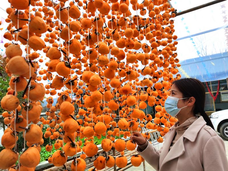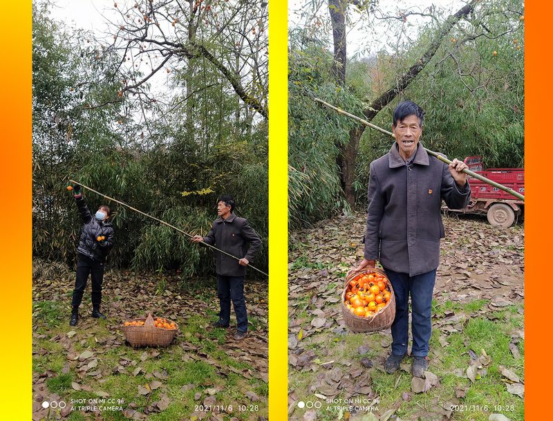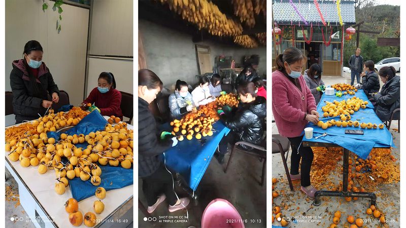 村干部和驻村帮扶队员们经过一番热烈讨论,决定收购柿子制柿饼。说干就干,他们风风火火,将村集体办的因疫情原因暂时歇业的“好客来”农家乐,改造成制作柿饼的小作坊,预计收购柿子2万斤。他们发布惠农广告,以每公斤1.2元的价格,向周边群众收购柿子。群众看到多年无人问津的柿子能变钱了,热情都很高,纷纷采摘后卖给作坊。村民王水朝几天里买了1800多斤柿子,看着得来的“意外之财”,脸上挂着乐呵呵的笑容,直夸干部们制作柿饼的这个点子好。截止目前,已经收购优质柿子7000余斤,完成计划的三分之一,让40多户农户从中受益。他们还组织本村20多名留守妇女就近务工,用地道的传统工艺,制作品相和味道俱佳的柿饼。目前,已制作柿饼2000多斤。