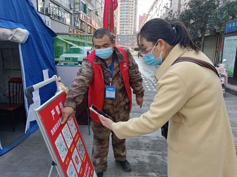 在徽县西南街社区监测点到岗第一天丁渤便熟练地开展着各项工作。从帮助群众扫行程码、健康码,引导过往群众按一米以上安全距离排队等候,到为监测点消毒、提醒群众带好口罩等等。只见他一会走来走去维持秩序,一会停下来耐心帮群众扫码、教他们怎样查询结果。一天下来,就在监测点那么一小块地方,丁渤的微信步数都保持在一万五千步左右。