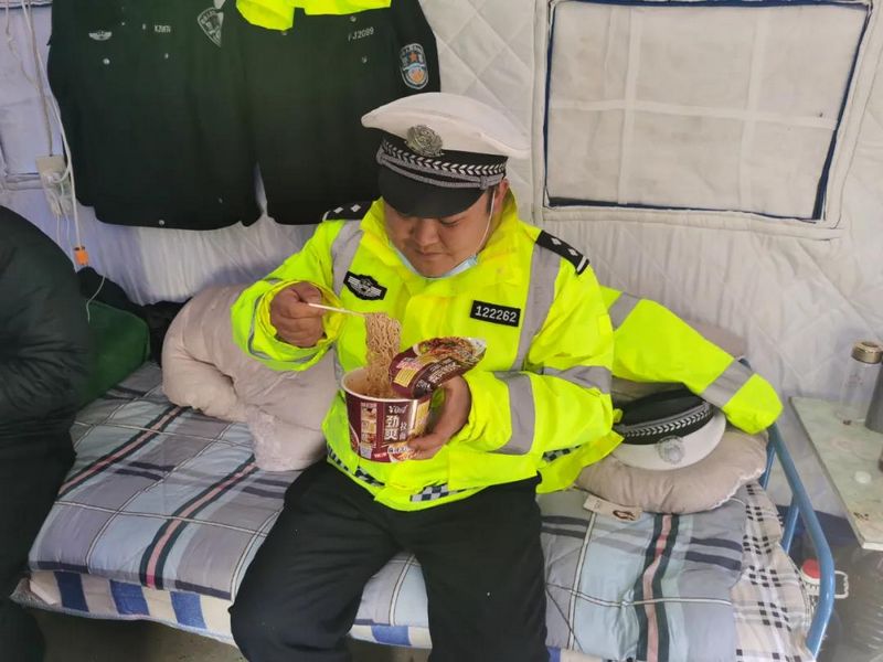 不畏艰苦,砥砺前行。作为疫情防控点临时负责人,隆浩和战友们24小时值班备勤,吃住都在执勤点。深秋的南腊公路寒气袭人,夜间最低温度都在零下,而执勤的民警们大部分时间都是站在公路上,冷的受不了了他们就在路边生个火堆取取暖。执勤点离国道村镇都很偏远,生活各方面都很不方便,平时一日三餐都只能吃泡面,偶尔想改善一下伙食,他跟战友们就自己动手,做一碗热乎乎的汤面,也算是一顿很奢侈的晚饭了。面对恶劣的工作环境,隆浩没有后退一步,而是带领执勤点民辅警积极克服困难,用坚决的意志和挺拔的身姿,守护着宕昌县的“西北大门”。