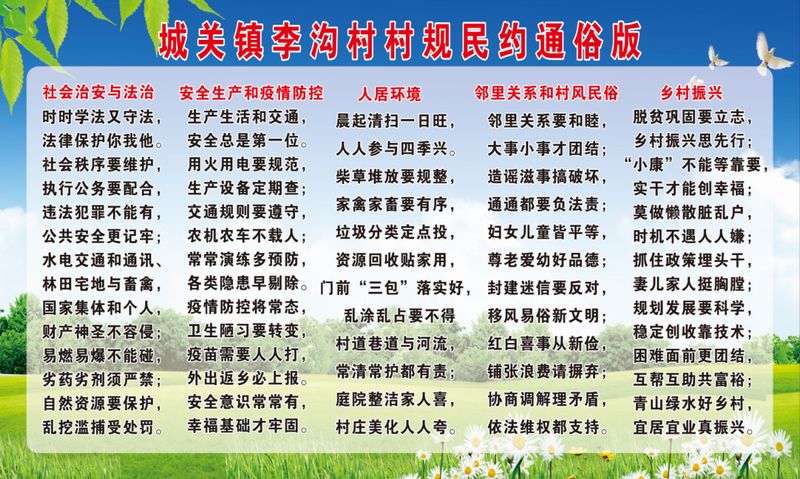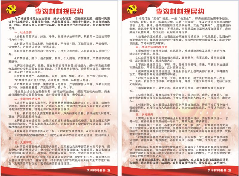 李沟村村规民约立足本村实际,围绕“社会治安与法治、安全生产和疫情防控、人居环境改善、邻里关系和村风民俗、乡村振兴”等五大方面做出规定和约定,旨在提高全村村民的法治意识、安全意识,使大家能够摒弃旧陋俗、崇尚新文明,团结友爱、奋力实干,真正做到乡村振兴、家庭幸福。