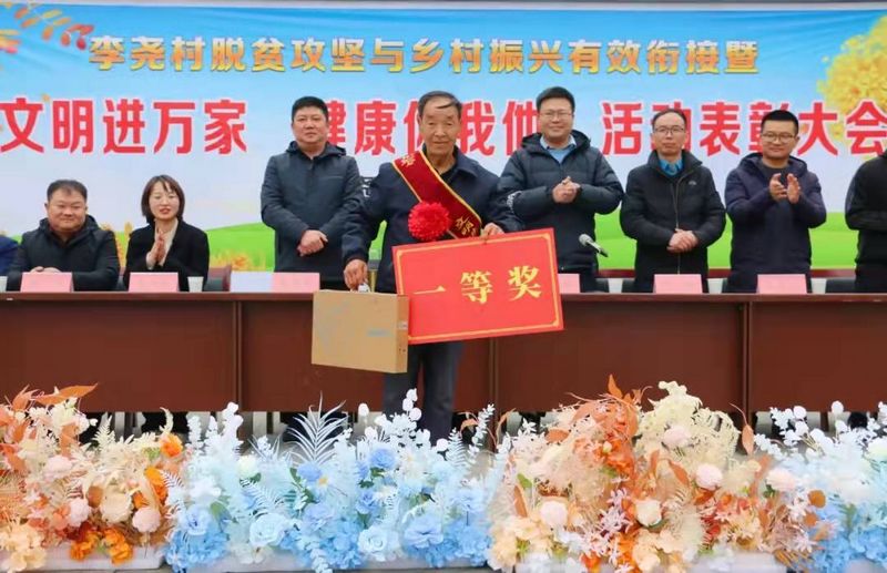 年末岁尾,隆冬时节,在西部秦巴山区的徽县伏家镇李窑村,一场别开生面的脱贫攻坚与乡村振兴有效衔接暨“文明进万家,健康你我他”先进典型表彰大会正在热闹举行,全村村民欢聚一堂,载歌载舞,为表彰大会增添了浓浓的喜庆与祥和,舞台旁边笔记本电脑,冰箱、彩电,盆子,拖把等奖品阵列排序,等待着新主人认领。