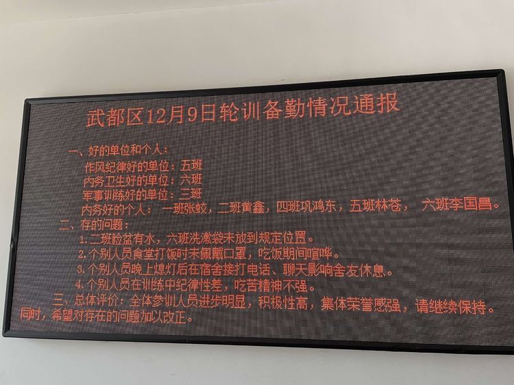 武都区人武部通过检查评比,建立奖惩机制,对当日军事训练、内务卫生、作风纪律进行检查,公开评比,选出当日最佳单位和个人,在操课前召开全连会议,由当日值班班长宣读通报,并在显示屏予以公示。