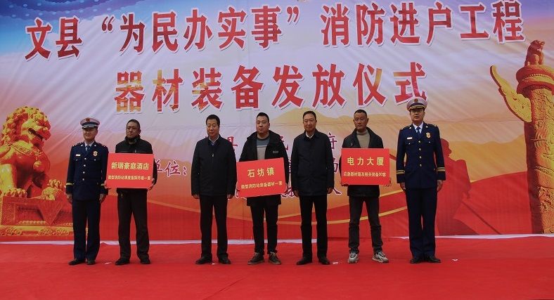 中国甘肃在线文县讯(通讯员 翟欣 杨双霜)为进一步推进2021年为民办实事实施方案,全面提升全县高层建筑及重点单位防范化解火灾风险能力。12月14日下午,文县消防救援大队在文津广场举行为民办实事消防进户器材装备发放仪式。县领导刘忠福出席仪式并讲话,各乡镇政府、社区、重点单位相关负责人参加,仪式由应急管理局领导主持。