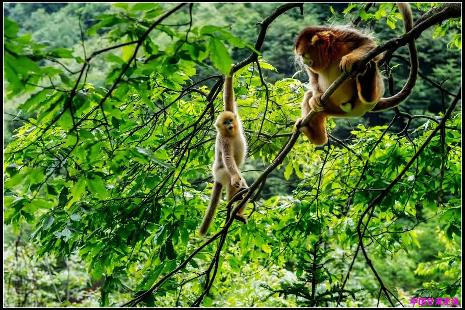 中国甘肃在线武都讯 (通讯员:赵春兰 王玉强)在甘肃省陇南市武都区裕河镇境内的甘肃裕河国家级自然保护区,成群结队的金丝猴在山林间嬉戏觅食。