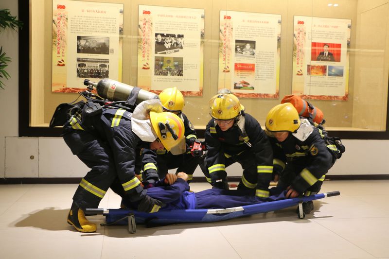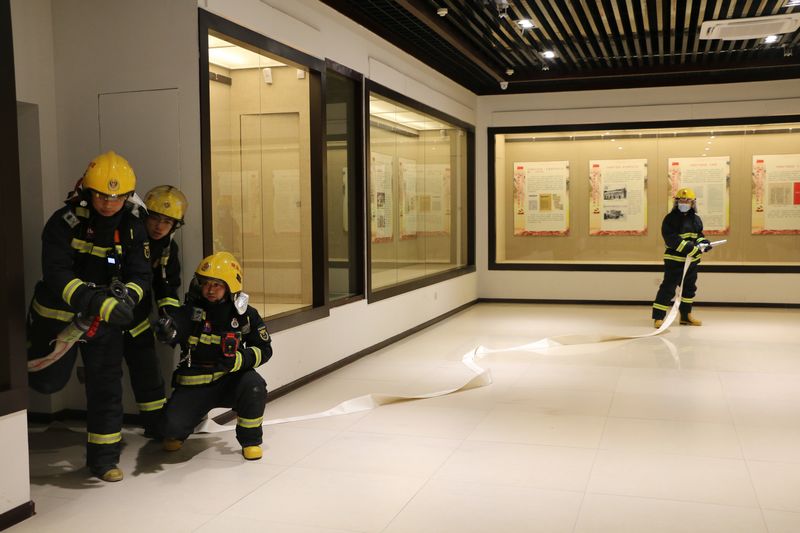 培训课上,消防救援大队宣传员紧密结合博物馆实际,采取消防常识讲解、火灾案例分析和技能实际操作相结合的方式向大家教授消防法律法规、消防安全知识、火场逃生自救要点、消防器材设施的使用等方面内容,紧密结合当前消防安全工作和日常生活中容易出现的问题进行了分析,并着重介绍了发生火灾之后如何引导疏散被困人员以及利用各种消防器材和设施扑救初期火灾等消防知识,并且耐心解答了大家提出的问题,同时,为了让参训人员切实掌握基本的灭火技能和实战能力,大队宣传员通过实物操作讲解的方式,手把手指导了灭火器、室内消火栓、气体灭火系统的工作原理等设施器材的实际操作,参训人员认真观看了演示,并踊跃参加灭火过程中的水带连接操作。随后,随着一阵急促的警报声响起,应急疏散演练正式开始。演练假设:博物馆一楼展厅因电线短路引发火灾,一名工作人员被困。馆内安保人员发现“火情”后,立即启动火灾应急预案,拨打119报警电话,并使用应急广播通知馆内游客迅速逃生、疏散游客。同时,消防救援人员立即赶到现场,依次展开火情侦查、人员搜救、固定消防设施启用、排烟照明、内攻灭火等灭火救援工作。20分钟后,“火情”成功被处置,演练圆满结束。