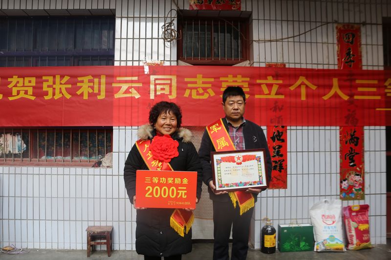张利云同志在空军某部队服役期间工作认真、踏实肯干,在执行某次任务时表现突出,成绩优异,被授予“三等功”。在张利云同志家中,空军某部队人力资源科干事当场宣读了喜报,成县人武部副部长宋建海亲自为张利云同志家属佩戴了“军属光荣”绶带,退役军人事务局局长陈玉明亲手将喜报送到了张利云母亲手中,张利云母亲接过“三等功”喜报后激动地说道:“感谢部队把我儿子培养的这么优秀,还将喜报送到家中,我们全家人都感到非常光荣和自豪,今后我们一定会一如既往的支持儿子在部队的工作,希望他能为祖国作出更多的贡献。”