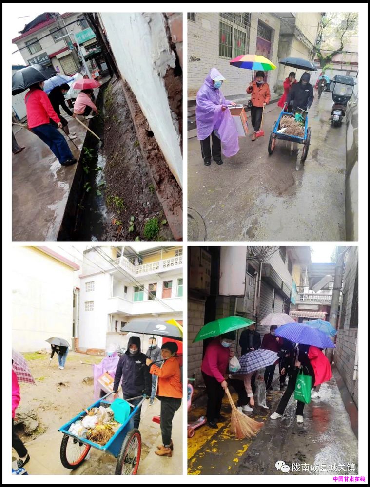 中国甘肃在线成县讯(通讯员:茅海波 刘娟)近日,我县迎来连绵的阴雨天气和降温,但天气的变化并没有影响我镇环境卫生包抓单位及各村、社区开展环境卫生整治工作的热情,按照环境卫生整治党群活动规定,近期,城中村(社区)及村(居)民小组长全员参与,积极组织发动群团组织、公益性岗位、卫生保洁人员以及辖区村(居)民,继续开展环境卫生综合整治党群活动。同时,网格责任单位、县直包抓责任单位,主动参与环境卫生综合整治工作,并协助村(社区)做好宣传工作。在雨中,广大干部群众,顶风冒雨开展环境卫生整治工作的身影,形成了一道美丽的风景线,为我镇环境卫生整治工作再鼓干劲,再添动力!