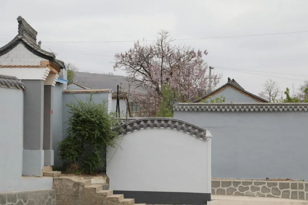 一进村,墙外两旁苹果花渐次开放,远处渺渺的炊烟在村与山间弥散。顺着宽阔平坦的水泥路往深处走,白墙灰瓦的现代化民居错落有致。