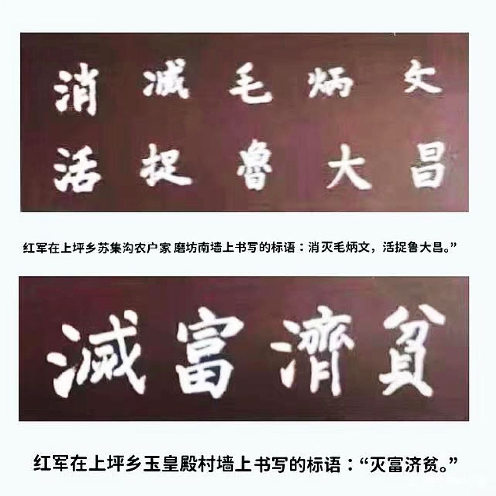 次日,红军宣传员用红土在村庄墙壁上,书写上了“消灭毛炳文,活捉鲁大昌”,“灭富济贫"等大幅标语。群众看见贺龙身披青褐色大衣骑枣红马,随军而过。18日上午,后续部队279团,在关院峡石垭豁受到鲁大昌部属李和义的阻击,2名战士牺牲,多人负伤,其中一名营长伤势严重,露宿石崖下,群众发现后,偷送麦草、洋芋、酸梨等用品,半月后才离去。五天后,红军一个营来到苏集沟,由当地3名向导带路到马坞镇柏家庄,另一个营约百余人返回黄咀村,由2名向导带路经沙家洞,去了本县的沙金方向。红军在上坪活动期间,本地农民李映春父亲、马科选四叔、李彦堂、包荣荣、杨步高、李翠香(女)、李俊义等9人参加了红军。