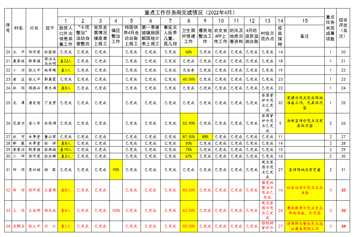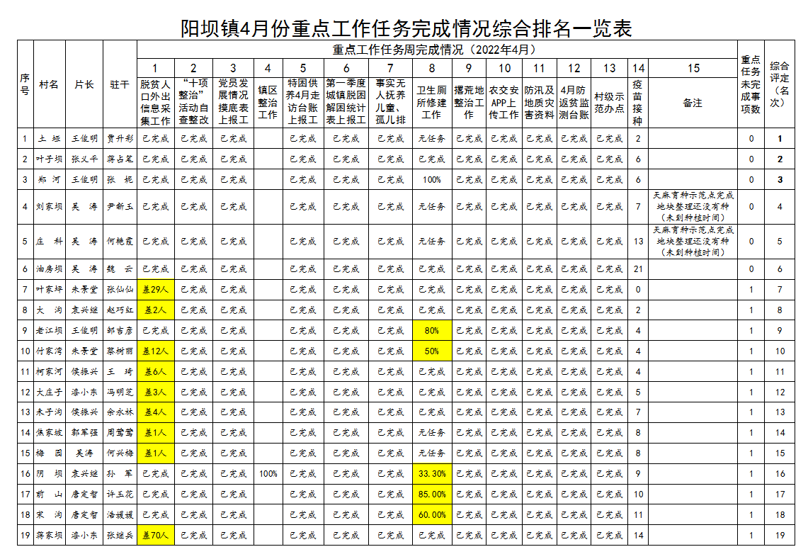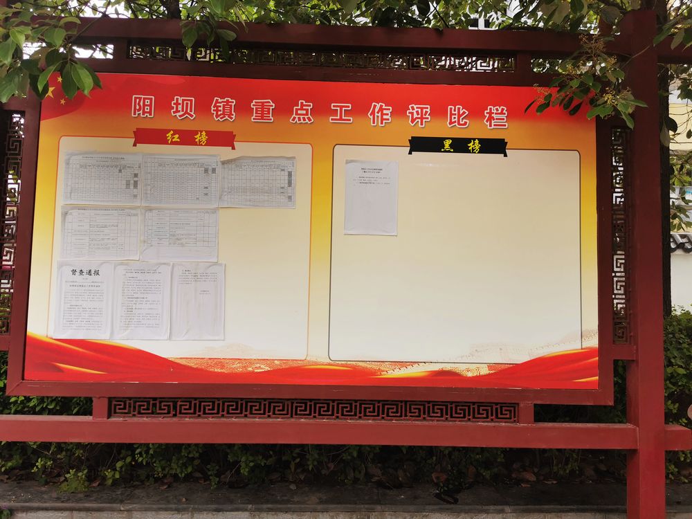 坚持以问题为导向,每周五对本周安排的各项工作进行分析总结,每周五对工作完成情况进行“回头看”,对于未在有效期限内完成各项工作任务的片长及驻干进行通报,并按照《阳坝镇干部管理制度》要求未完成工作任务的片长及驻村干部周末加班,确保各项工作按期高质量完成,并结合周末督查情况形成工作通报,在每周党委(扩大)会议及周一例会上进行通报,并在“红黑榜”进行公布。通过周通报制度的推行,各项工作有序推进、重点难点问题高效解决,切实转变了工作作风,提高了全体干部的干事激情。