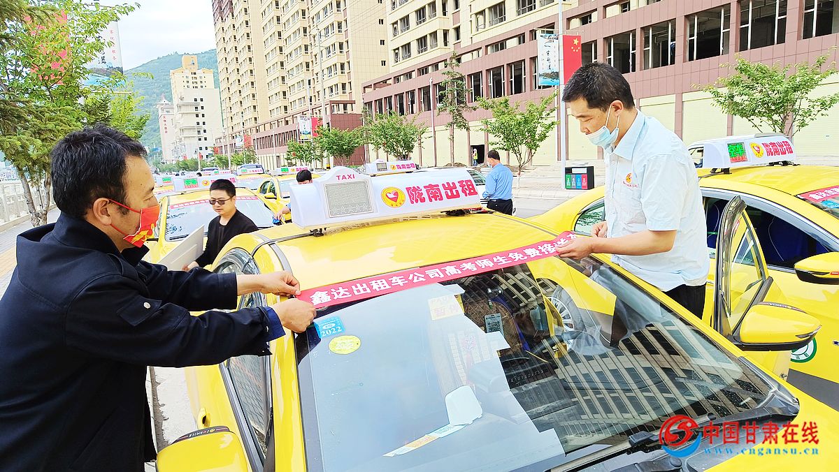 中国甘肃在线宕昌讯 6月7日,宕昌县2022年“高考直通车”发车仪式现场,工作人员为送考车贴车贴。