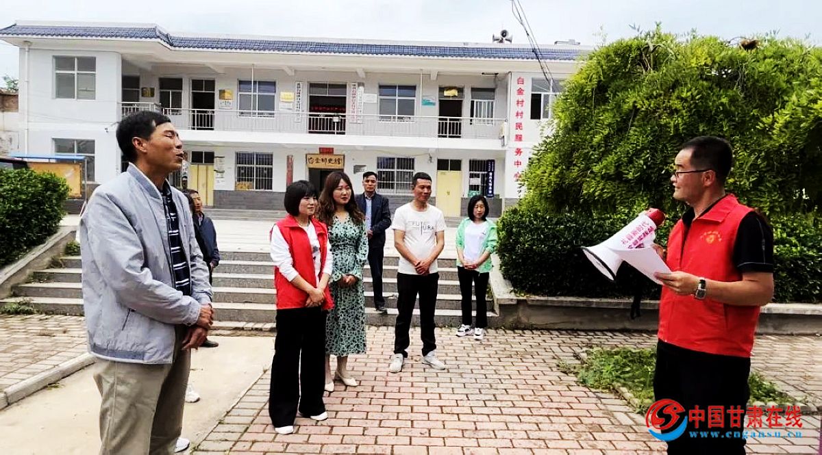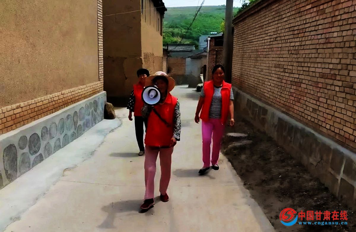 “中国共产党甘肃省第十四次代表大会5月27日在兰州隆重开幕。尹弘代表中国共产党甘肃省第十三届委员会向大会作题为《继往开来奋进伟大新时代 富民兴陇谱写发展新篇章 为全面建设社会主义现代化幸福美好新甘肃努力奋斗》的报告。”白金村村干部,妇联干部分别拿着小喇叭,以流动宣讲的形式,让群众清楚的了解到甘肃省第十四次党代会精神。