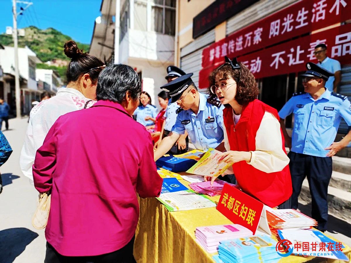 中国甘肃在线武都讯(通讯员 刘杰灵)为进一步提升广大妇女群众识毒拒毒防毒意识,在第35个国际禁毒日来临之际, 陇南市武都区妇联联合区禁毒办深入武都区甘泉镇开展“巾帼在行动,不让毒品进我家”暨“禁毒宣传进万家,阳光生活不‘毒’行”禁毒宣传活动。