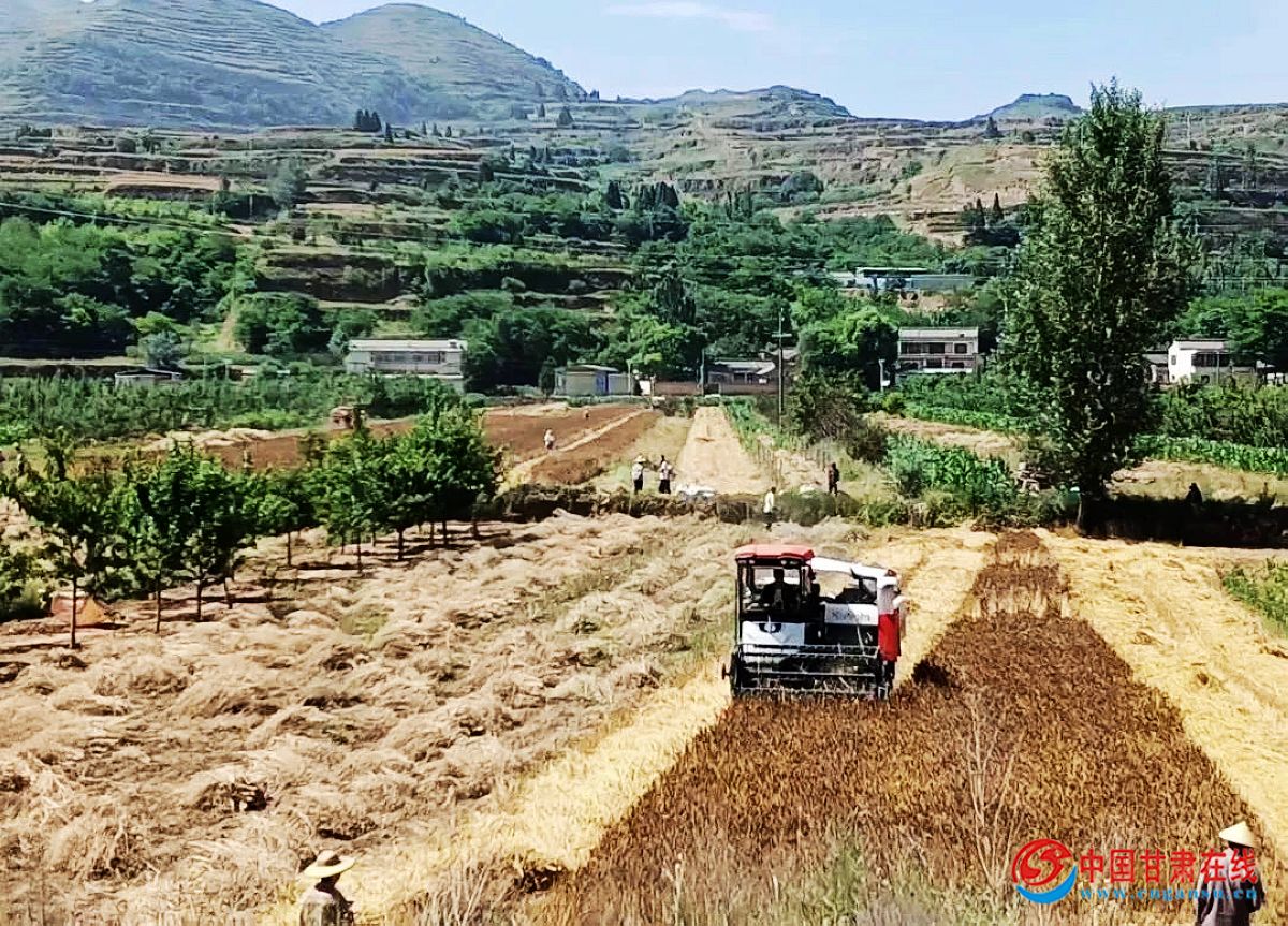 中国甘肃在线礼县讯 七月的礼县大地,处处洋溢着丰收的喜悦。近日,记者在西汉水沿岸的田间地头看到,麦田里泛起片片金黄,饱满的麦穗弯腰低垂,到处都是忙着收割的农民,大家紧抓天气晴好的有利时机,全方位投入小麦抢收中,一派繁忙的丰收景象。