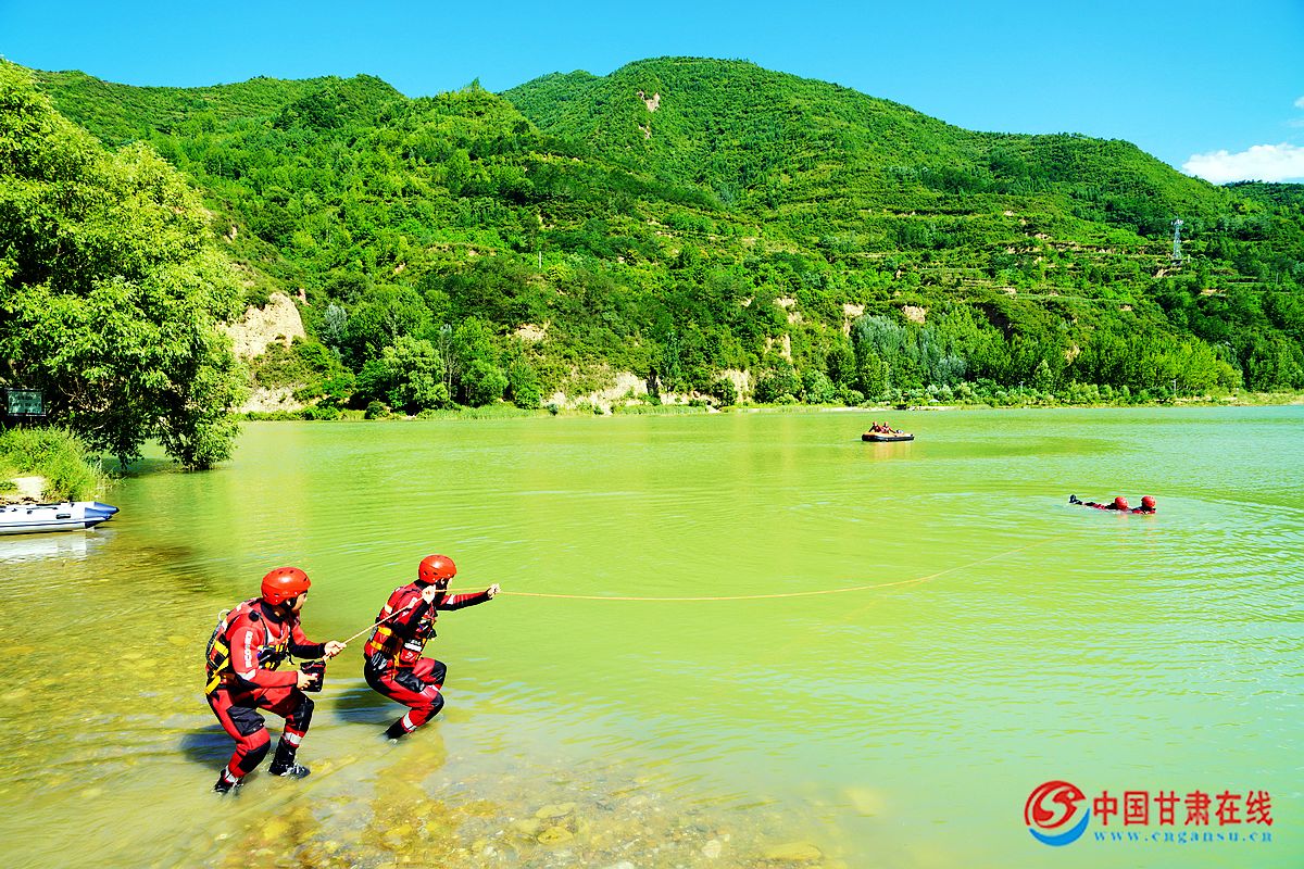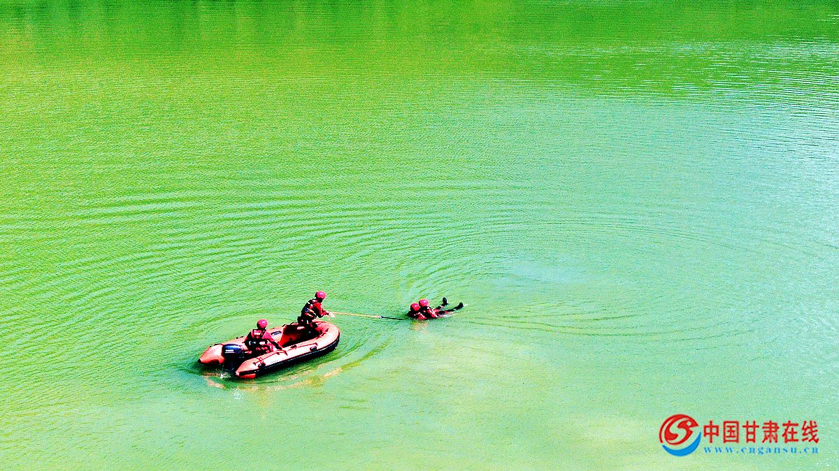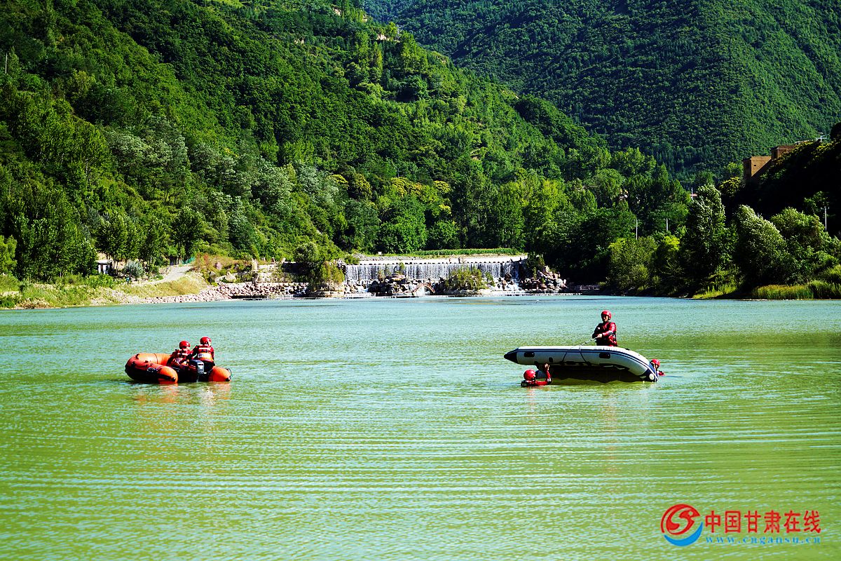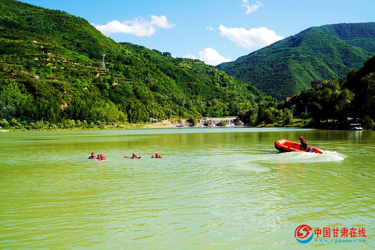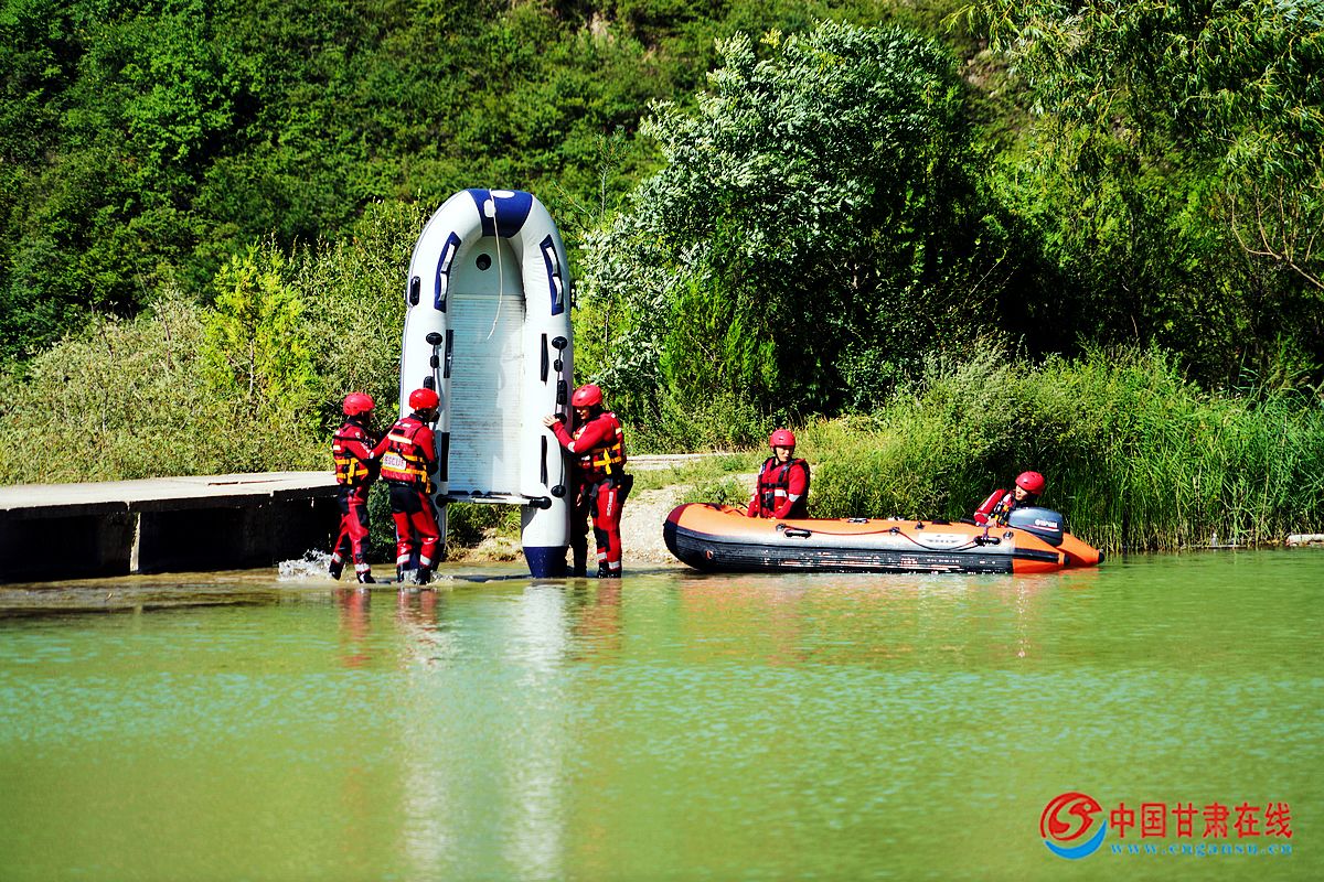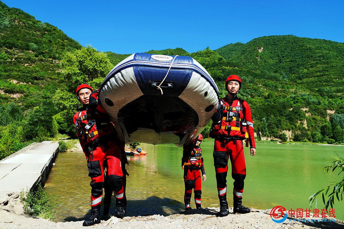 图片说明:2022年7月20日,宕昌县消防救援大队在水域开展防汛救灾应急演练。