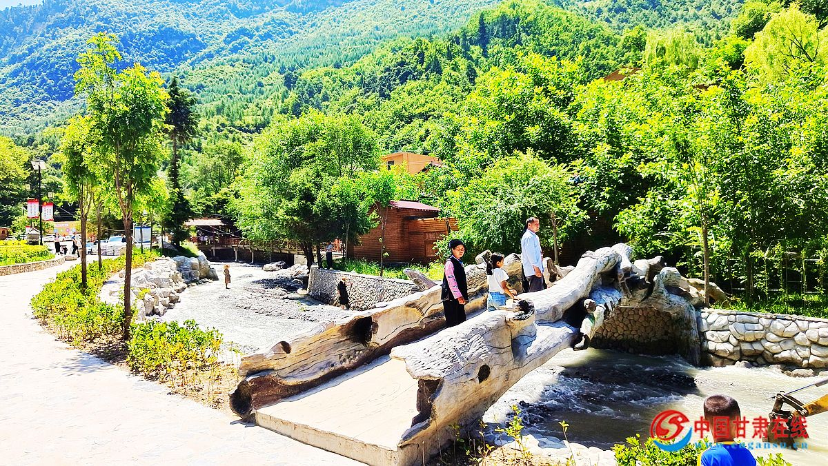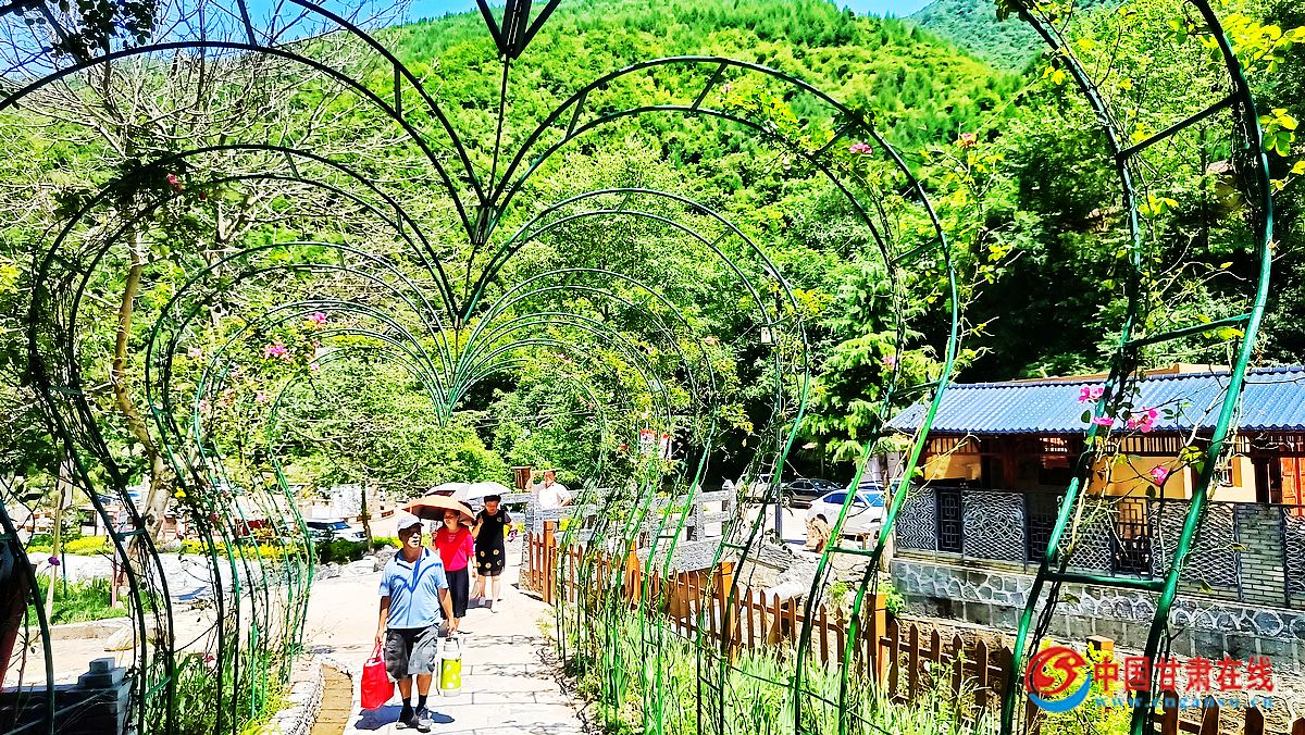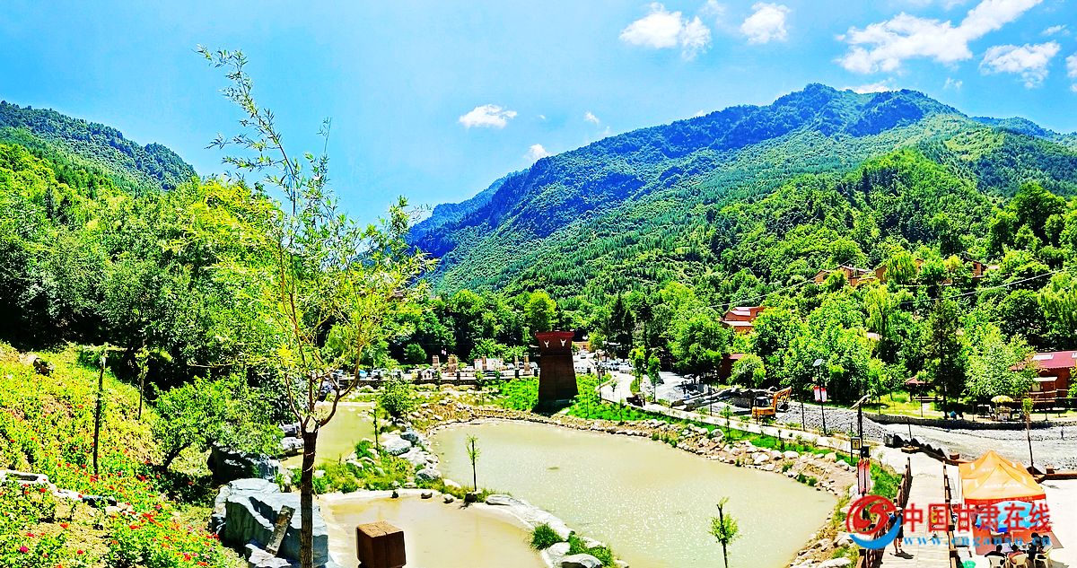中国甘肃在线宕昌讯 盛夏,艳阳高照。陇南官鹅沟5A级景区——宕昌县新城子藏族乡岳藏甫村一渠碧水波光粼粼,倒映着蓝天白云;河畔以水串景,风光旖旎;村民沿岸依水兴业,笑靥如花,勾勒出一幅“河畅水清、岸绿景美、业旺人和”的生态画卷。