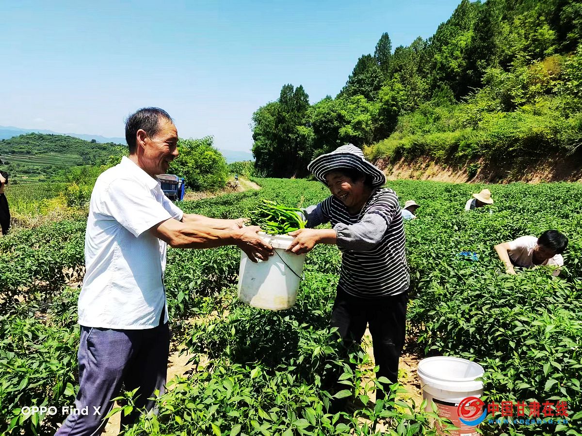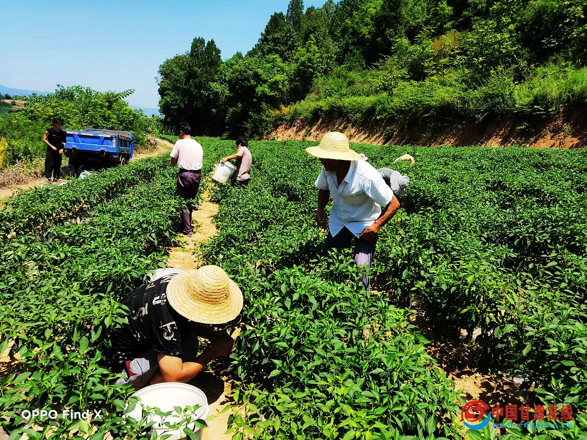 中国甘肃在线徽县讯(通讯员 马育江)眼下,正是辣椒采收的季节,在徽县永宁镇高山村辣椒种植基地,150多亩辣椒也迎来了今年的首茬丰收,村民们笑逐颜开,正忙着对辣椒进行采摘、挑选、装筐、打包、装车,一派丰收的繁忙景象。