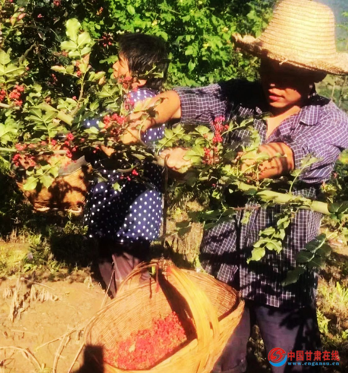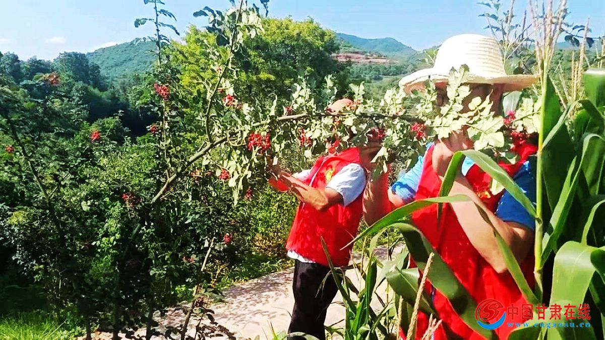 中国甘肃在线两当讯 7月盛夏,正是两当县站儿巷镇花椒成熟采摘季节,农户房前屋后、田间地边,随处可见硕果累的花累椒树,一簇簇红彤彤的花椒缀满枝头,山风拂面,一股股浓郁的椒香扑鼻而来。花椒树下,人影攒动,既有技术娴熟的农户,也有略显生疏的“红马甲”。