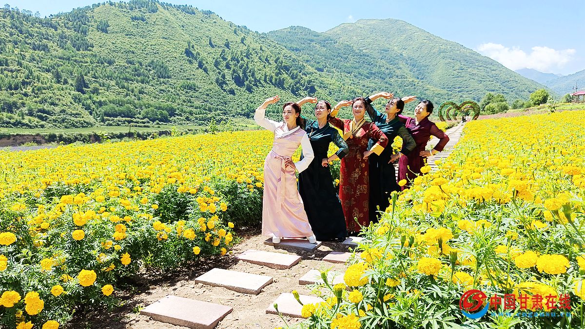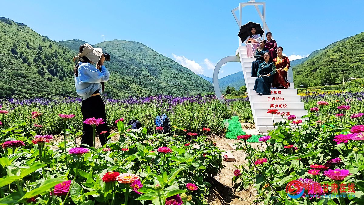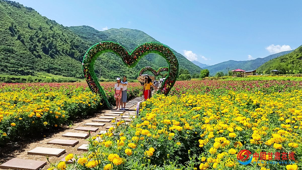中国甘肃在线宕昌讯 8月初,宕昌县多次出现高温天气,蓝天白云、青山绿水的何家堡缸沟生态风情线成为广大市民休闲、娱乐、纳凉、消暑的绝佳去处。 向阳花、格桑花、月季花恣意开放,红色、黄色、粉色点缀着夏日的羌韵花海,构成了一幅绚丽的金色图画。每逢周末,各地游客纷纷来这里拍照打卡,花海为底,美好定格。