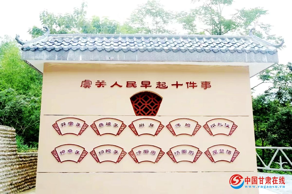 近年来,徽县虞关乡把新时代文明实践工作融入群众日常生活中,以人居环境整治为抓手,从“开窗子、叠被子……擦桌子、扫院子……”等卫生小事为切入点,总结提炼了“虞关乡人民早起十件事”,在各村醒目处制作上墙,党员干部示范带头,全民推行,以文化人、成风化俗,依此逐步引导广大群众变“要我打扫”为“我要打扫”“每日打扫”,养成良好卫生习惯,成为全民俗约,使“虞关人民早起十件事”逐渐成为引领社会新风尚的行为准则,有效消除了虞关乡群众卫生习惯差、乱堆乱放、乱扔乱倒等陈规陋习,人居环境质量得到持续提升,让乡村不仅有“面子”更有“里子”。