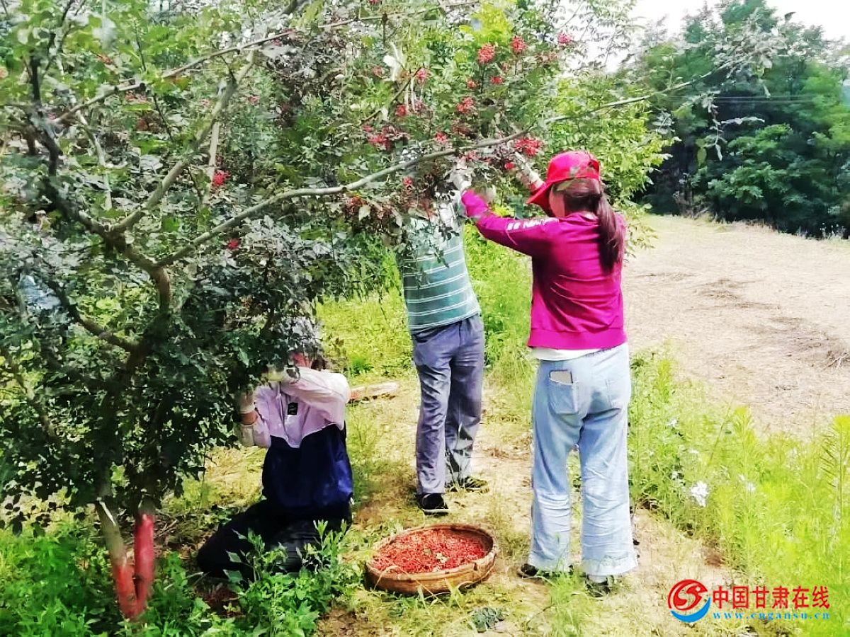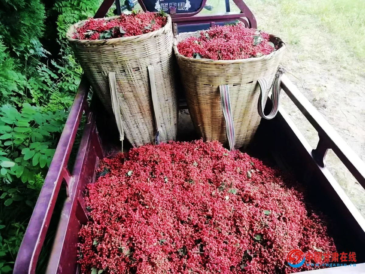 中国甘肃在线成县讯 当下,正是花椒丰收的时节,走进纸坊老庄村,一簇簇颗粒饱满的花椒挂满枝头,将整个田野染成红色,山风吹来,椒香扑鼻,村民们背着背篓、挎着竹篮采摘花椒,脸上洋溢着收获的笑容。