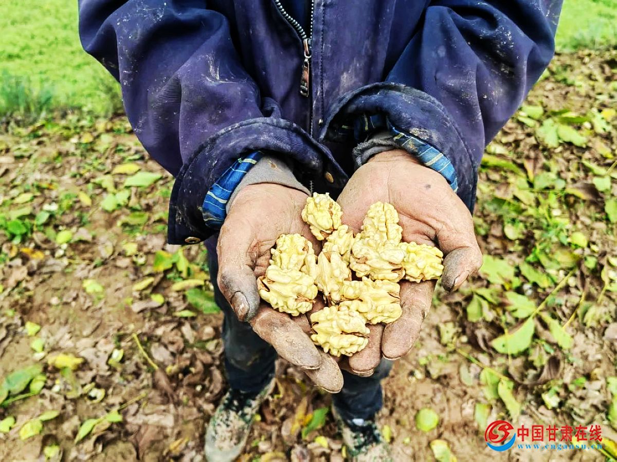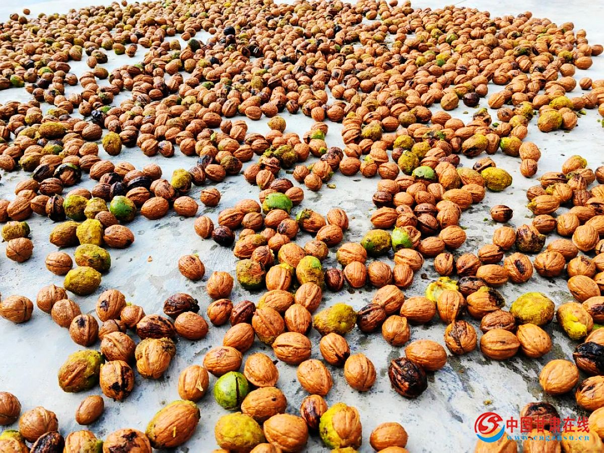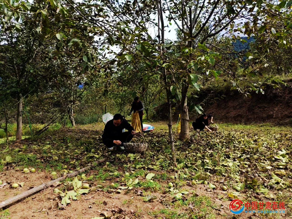 中国甘肃在线两当讯 每年临近秋分时节,两当县张家乡这片土地都会上演着一场人与自然的联欢。竹竿“啪啪啪”地敲打声、核桃落地的“噼噼啪啪”声、群众的欢笑声,总会交织成一曲欢快的乐章。