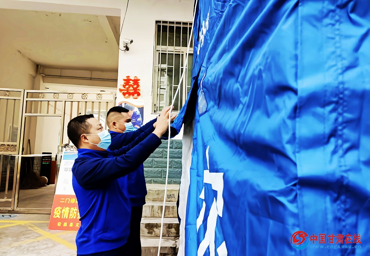 正当人们还沉浸在欢度国庆的喜悦中的时候,宕昌突发疫情。10月7日,宕昌县文联下沉到社区网格点二门诊值班。由于要落实24小时值班值守制度,县委、县政府为每个防控点配发了帐篷、床、火炉等物资。帐篷发下来后,值班的同志却傻眼了,翻来覆去的研究还是不会将帐篷搭起来,这一切被刚刚出任务回来的宕昌县消防救援大队大队长吴建国和教导员丁洋看在眼里。“让我们来吧。”吴建国和丁洋带领6名消防救援志愿者踊跃上阵,不一会儿,帐篷便搭好了。