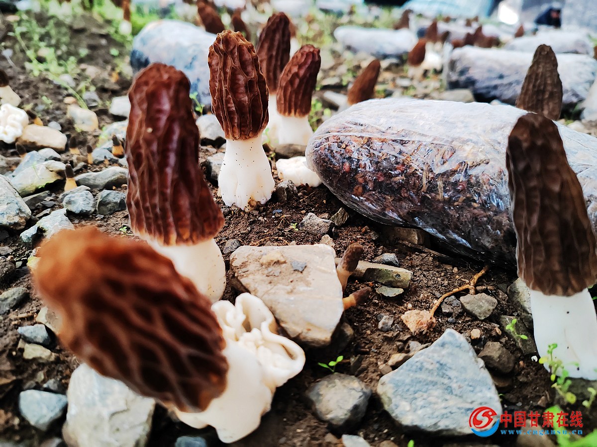 中国甘肃在线宕昌讯 近日,在宕昌县两河口镇曹下村羊肚菌种植基地的阳光大棚里,大大小小的羊肚菌撑起一把把褐色的“小伞”,鲜嫩肥厚、长势喜人。