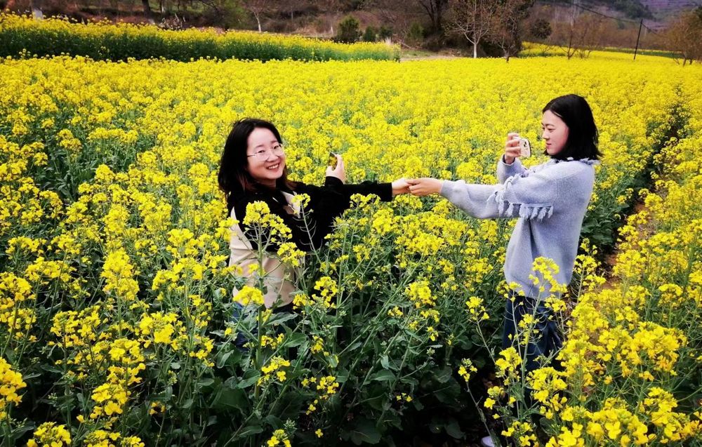 一团团、一簇簇的油菜花随风轻轻摇曳,在阳光的照射下闪耀着金光,甜甜的花香不时引来勤劳的蜜蜂忙碌地穿梭在花丛间,与周边的村落、蓝天、绿树构成了一幅优美的乡村画卷,游人们趁着闲暇之时,漫步在田间徜徉在花海中享受着田园风光,纷纷驻足拍照合影留念。