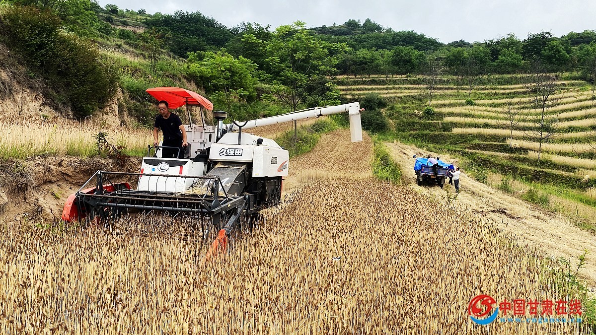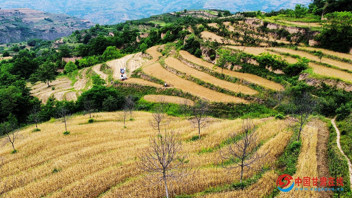 夜来南风起,小麦覆陇黄。随着小麦夏收进入高峰期,礼县中坝镇15000多亩山地梯田冬小麦陆续成熟,全镇开启夏收农忙模式,金色麦田里到处都是机器的轰鸣声和农民挥镰收麦的忙碌景象。