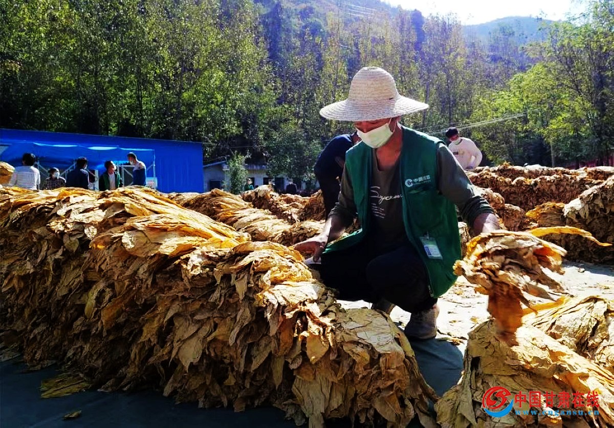 中国甘肃在线两当讯 一分耕耘,一份收获。时间是最公正的裁判员,不辜负每一个追梦人。八月的两当县兴化乡群山涌翠、万物竞秀,千亩碧油油的烤烟开出粉红色的花朵,人们穿梭在2米多高的烤烟间采收烤烟,脸上洋溢着丰收的喜悦。碧绿的烟叶挂进挂进烤烟房,经过几天7天的烘烤,成为金灿灿的“黄金叶”,烟草公司包收购,价格稳定,农户一年的收入便有了保障。