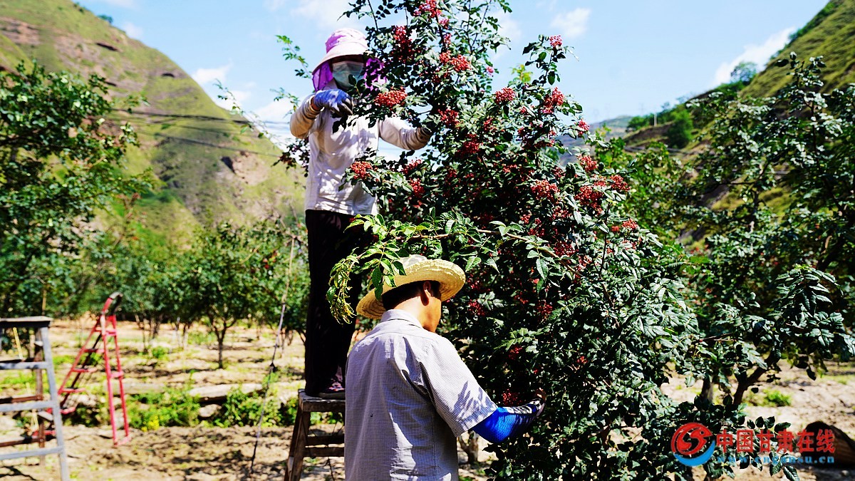 中国甘肃在线武都讯(通讯员 石晨)无穷碧玉,点点丹红。时下,武都区百万亩花椒进入采收期,田地里一片忙碌喜庆的丰收景象,麻香十足的小花椒为这个夏天增“香”添“味”。