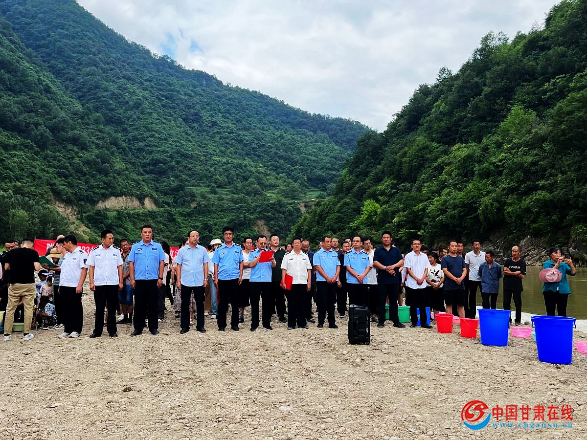 中国甘肃在线两当讯 8月9日,以“保护渔业资源,营造碧水蓝天”为主题的陇南市保护水生生物资源(两当县)增殖放流活动在两当县嘉陵江流域银杏段举行。