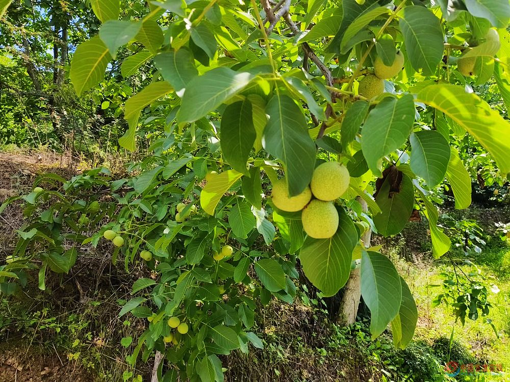中国甘肃在线两当讯 眼下,两当县杨店镇青皮核桃陆续进入成熟期,走进杨店镇杨店村温家山核桃示范园,挂满枝头的青皮核桃在夏日艳阳的映射下闪着翠绿色,树影斑驳间,累累核桃点缀在树上,三颗一枝,五颗一簇,长势喜人。