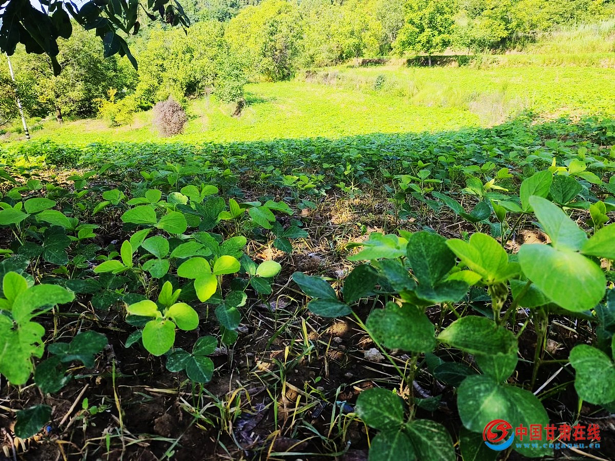 中国甘肃在线两当讯 抬头见蓝天,平视望树林,低头看产业。走进两当县杨店镇颜家河村核桃种植基地,一眼望去,连绵不断的核桃林,郁郁葱葱,太阳透过茂密的枝叶在青翠欲滴的青果核桃上洒下斑驳的光点,随风摇曳的树枝挂满核桃,树下绿油油的大豆争相耀眼,一同奏响核桃大豆双丰收的夏日协奏曲。