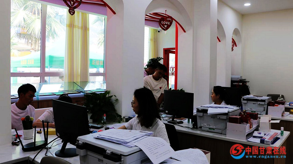 在整个婚姻登记处都洋溢着喜庆热烈的氛围,登记大厅充满着亲情化的沟通和人性化的服务。武都区民政局婚姻登记处搬迁新址后,着力设计了婚姻登记大厅,给新人营造出浓厚的新时代婚俗文化氛围。婚俗大厅以婚姻立法变迁为主题,沿着时代的车轮,徐徐展开婚姻登记的发展历史。时代在变化,婚礼婚仪更加时尚、简洁,每一张过去的结婚证书都充分展现着那个时代的特色,却表达着爱的唯一主题。在这样的婚姻大厅里办理结婚登记,新人将留下美好的回忆。