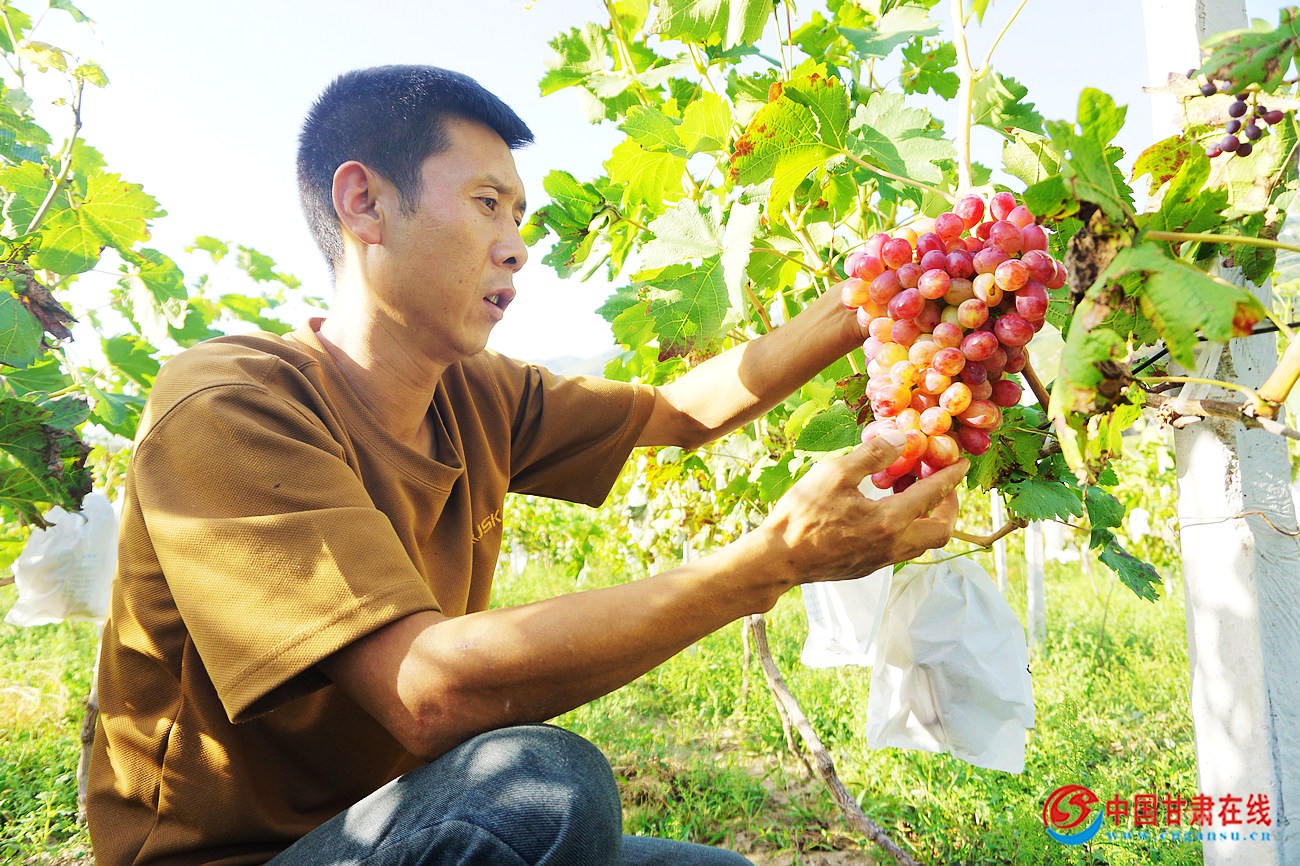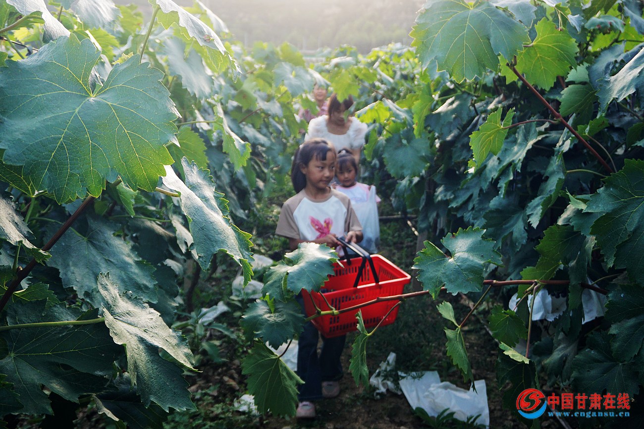 中国甘肃在线宕昌讯 秋收时节,走进宕昌县何家堡乡何家堡村返乡青年杜军创办的家庭农场葡萄采摘园,一排排绿油油的藤架上挂满了沉甸甸的葡萄,个头饱满、圆如珍珠,游客们领着孩子正在采摘自己满意的葡萄,尽情感受乡村味道。