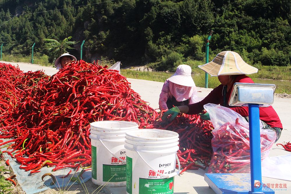 中国甘肃在线辉县讯(通讯员 马育江)眼下,正值红辣椒收获的好时节。近日,在徽县永宁镇岳王村甘肃陇青智控农业农业产业园内一排排辣椒红绿交错,长势喜人,工人们穿梭在辣椒丛中,双手不停地游走在椒树梢上,左右开弓不停地将一个个红彤彤的辣椒采收入篓。