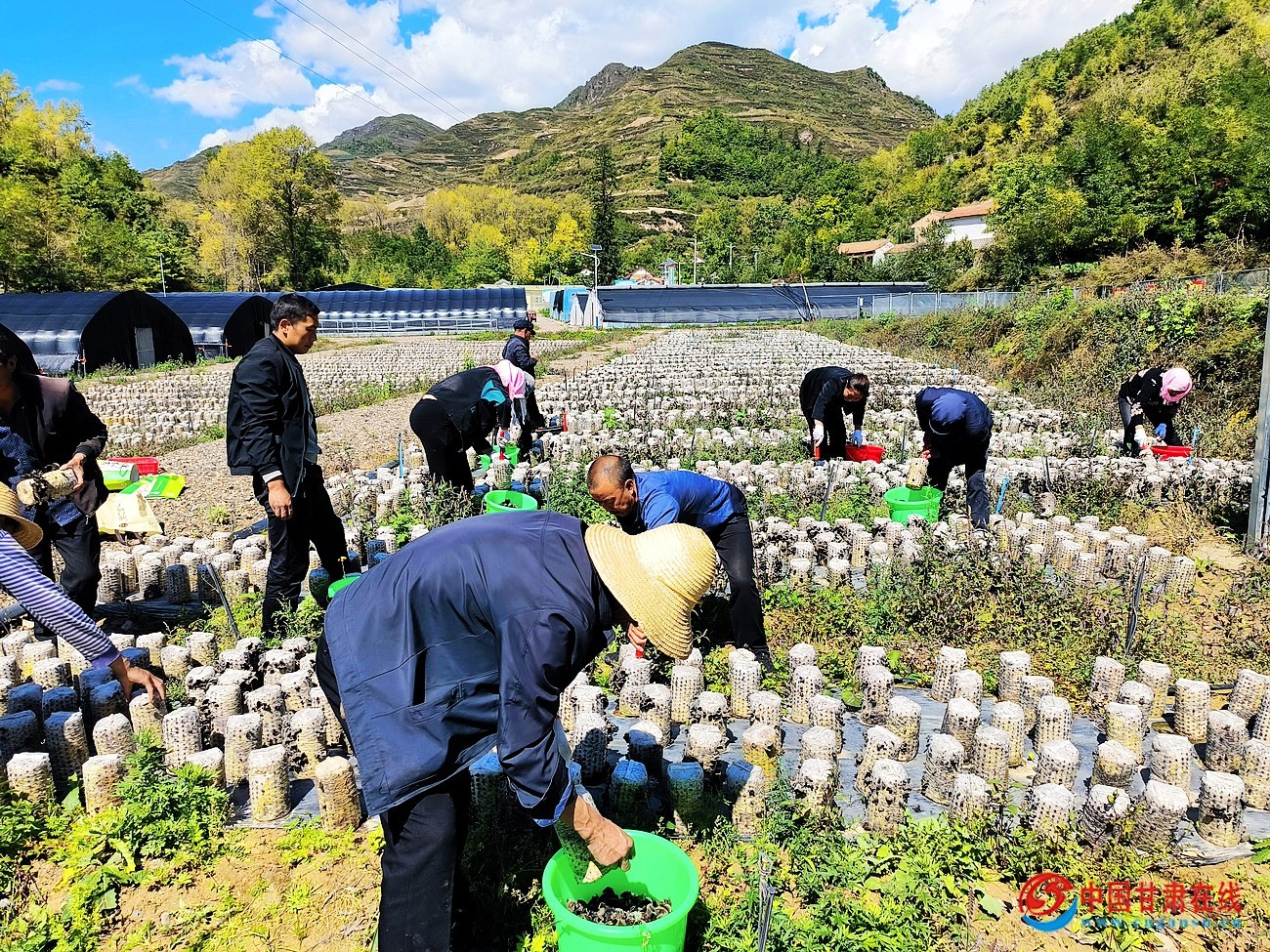 中国甘肃在线宕昌讯 金秋时节,走进宕昌县好梯乡麻子沟村特色产业园,一个个食用菌棒亭亭玉立、整齐排列、竞相绽放,菇农们正小心翼翼地将一朵朵露天黑色木耳从菌棒上采摘下来放入桶中。