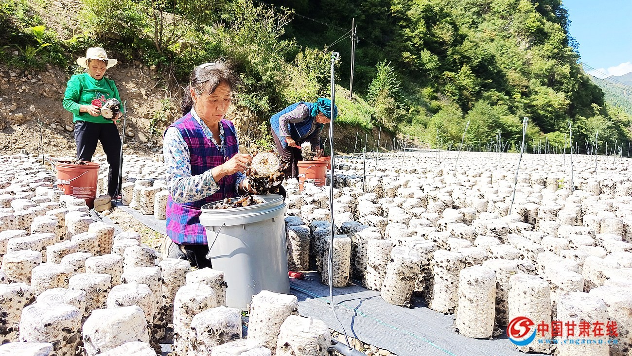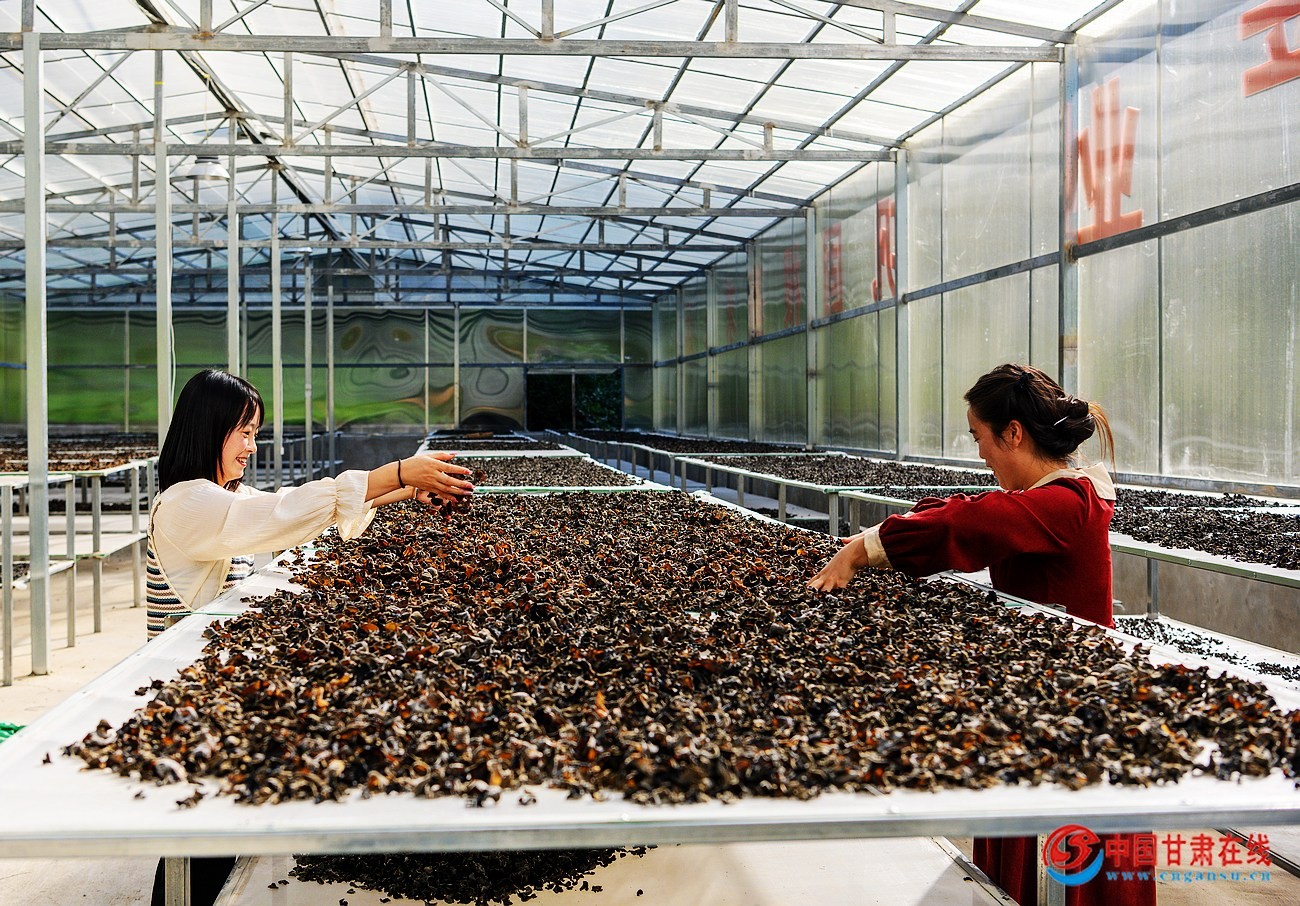中国甘肃在线宕昌讯 仲秋时节,在宕昌县竹院乡大草坡村党支部领办集体经济发展产业示范园内,一排排黑油油的露天木耳郁郁葱葱,绽放棒头,农户娴熟地采摘成熟的木耳,基地里一片繁忙的景象。