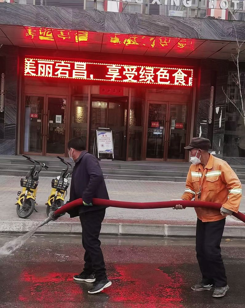 10月2日一大早,记者在新时代文明实践广场路口看到,环卫工人正在一丝不苟地开展日常作业,除了清扫路面、清理路旁杂物和垃圾,她们还要对保洁车、果皮箱掏尽进行冲洗。
