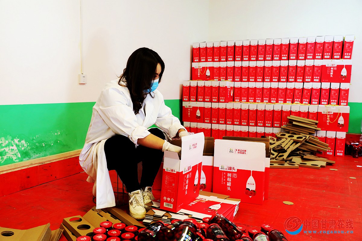 在下付村杨君兰特色产业农民专业合作社树莓加工车间,机器轰鸣,树莓果先是被倒入水槽分捡清洗,烘干、装瓶、灌浆、高温灭菌,制成晶莹透亮的罐头,再通过生产线打码、贴标、装箱……