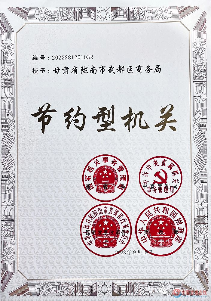 中国甘肃在线武都讯(通讯员 胡本平 石刚龙)近日,武都区商务局被国家机关事务管理局、中共中央直属机关事务管理局、国家发展和改革委员会、财政部联合授予全国“节约型机关”荣誉称号。