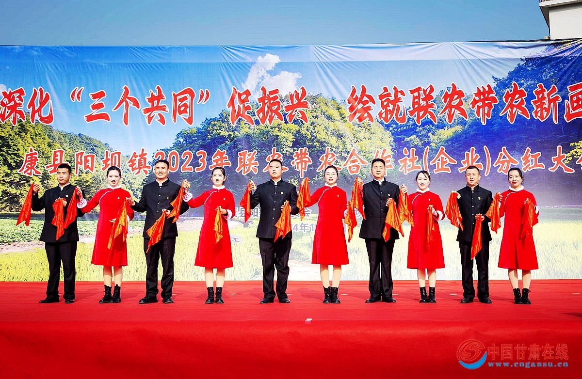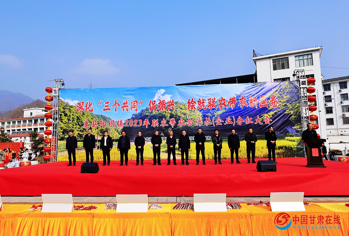中国甘肃在线康县讯(通讯员:高燕、赵琳)产业分红助民富,乡村振兴动力足。1月12日,甘肃康县阳坝镇2023年联农带农合作社(企业)分红大会隆重举行。县政协主席唐正林,县委副书记马宇光、县人大常委会副主任李伟、政府副县长何迎军等各位领导出席了会议,县委组织部、农业农村局、乡村振兴局、县红十字会、中国市政工程西北设计研究院有限公司等各级帮扶单位相关负责人、镇村干部、受益群众代表、企业代表等300余人参加大会。