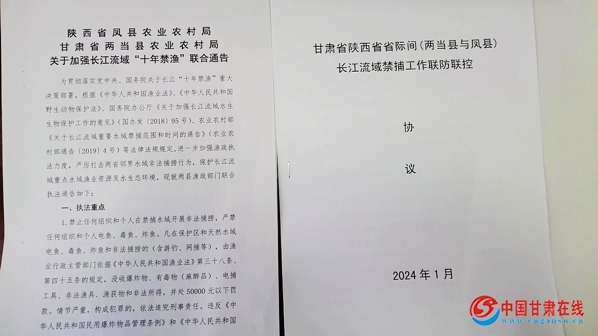 中国甘肃在线两当讯 1月11日,两当县农业农村局与陕西省凤县农业农村局在两当召开“甘肃省陕西省际间(两当县-凤县)长江流域禁捕联防联控工作会议”。会上,签订了两地长江流域禁捕工作联防联控协议,就毗邻两县交界水域的执法通告、共管协议条款中的执法形式、执法重点、执法范围进行了进一步商讨细化。